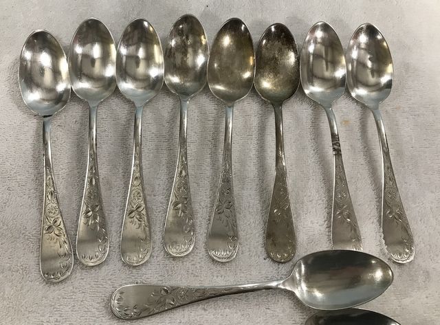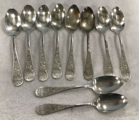 10 G.W. Meyer Sterling Spoons, monogrammed, etched designs, 6.835 ozt. 10 G.W. Meyer Sterling Spoons, monogrammed, etched designs, 6.835 ozt.