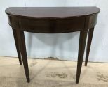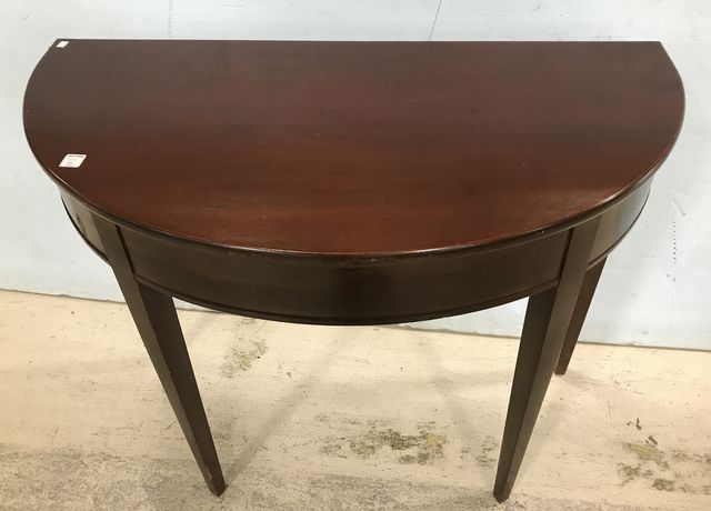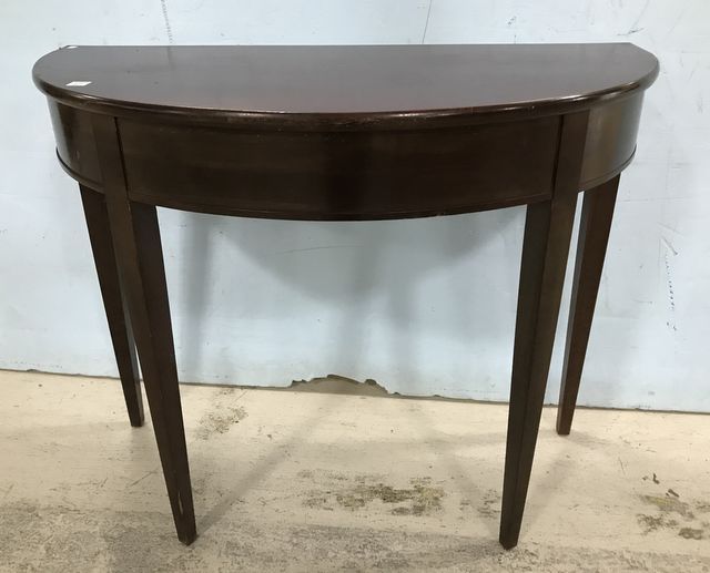 Finch Furniture Company Demi Lune Console Table, mahogany, half moon, has some wear on finish, 30"h., 38"w., 19"d. Finch Furniture Company Demi Lune Console Table, mahogany, half moon, has some wear on finish, 30"h., 38"w., 19"d.