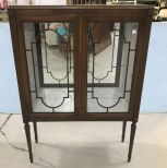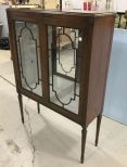 French Style Walnut Curio Cabinet, Double glass door with mirrored back, two glass shelves, lighted, has candle residue on top, 56"h., 39"w., 15"d. French Style Walnut Curio Cabinet, Double glass door with mirrored back, two glass shelves, lighted, has candle residue on top, 56"h., 39"w., 15"d.