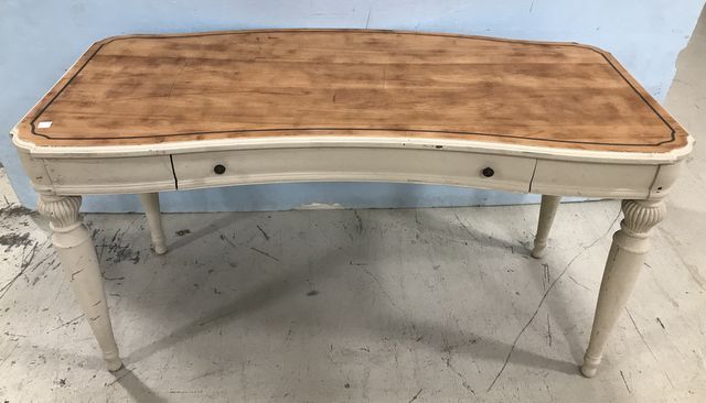 French Style Writing/Work Desk, painted base with natural wood top, has inlaid border, drop down drawer with slide out keyboard holder, has some scratches on finish, 31"h., 60"w., 27"d. French Style Writing/Work Desk, painted base with natural wood top, has inlaid border, drop down drawer with slide out keyboard holder, has some scratches on finish, 31"h., 60"w., 27"d.