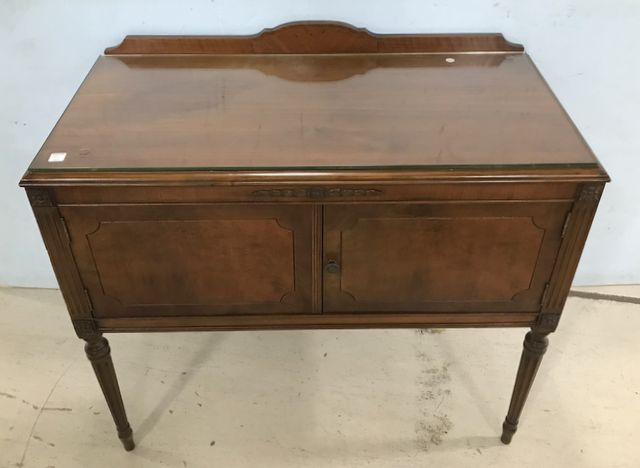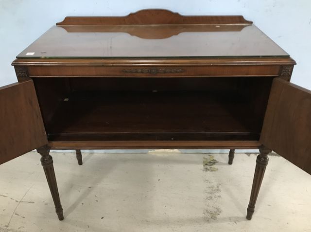 French Provincial Mahogany Server, double door, back splash, good condition, 36"h., 39"w., 18"d. French Provincial Mahogany Server, double door, back splash, good condition, 36"h., 39"w., 18"d.