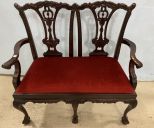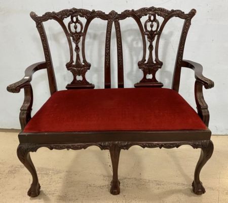 Vintage Chippendale Style Double Chair Settee, red felt seat cushion, ball-n-claw, dark finish, good condition, 39"h., 44"w. Vintage Chippendale Style Double Chair Settee, red felt seat cushion, ball-n-claw, dark finish, good condition, 39"h., 44"w.