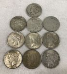 Ten Peace Liberty Silver Dollars, circulated condition, good to average, 7 1923, 3 1922. Ten Peace Liberty Silver Dollars, circulated condition, good to average, 7 1923, 3 1922.