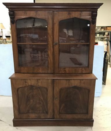 American Walnut Cupboard, c1880, Bookmatch burl on doors, original glass on upper doors, two pieces, has key, 74"h., 51"w., 21"d. American Walnut Cupboard, c1880, Bookmatch burl on doors, original glass on upper doors, two pieces, has key, 74"h., 51"w., 21"d.