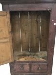 Antique Primitive Hand made, old red color, three drawers, single door, has age wear and damage, one piece, 72"h., 36"w., 17"d. Antique Primitive Hand made, old red color, three drawers, single door, has age wear and damage, one piece, 72"h., 36"w., 17"d.