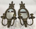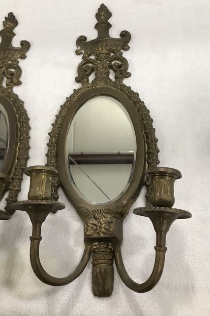 Antique Reproduction Ornate Candle Wall Sconces, each with two arms, beveled mirrors, 20"h. Antique Reproduction Ornate Candle Wall Sconces, each with two arms, beveled mirrors, 20"h.
