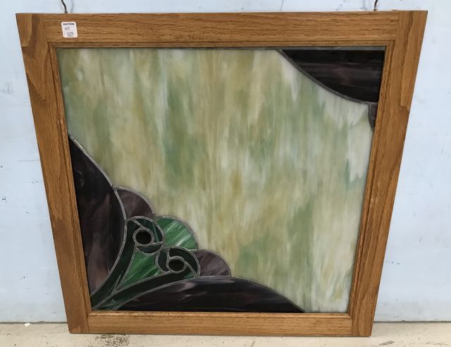 Leaded Stained Glass Hanging Panel, multi colored, oak wood framed, good condition, 27" x 27". Leaded Stained Glass Hanging Panel, multi colored, oak wood framed, good condition, 27" x 27".