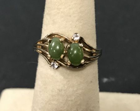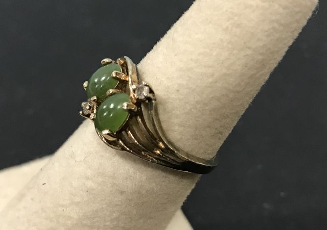 Vintage Style Sterling with Gold Plate Ring, jade stone and diamonds, size 6. Vintage Style Sterling with Gold Plate Ring, jade stone and diamonds, size 6.