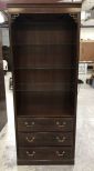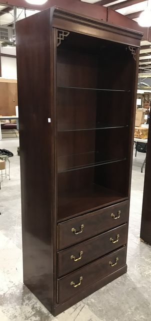 Drexel Chippendale Style Bookcase Case, cherry finish, lighted, glass shelves, three drawer, banded drawers, was part of an entertainment center, 81"h., 18"d., 31"w. Drexel Chippendale Style Bookcase Case, cherry finish, lighted, glass shelves, three drawer, banded drawers, was part of an entertainment center, 81"h., 18"d., 31"w.