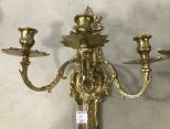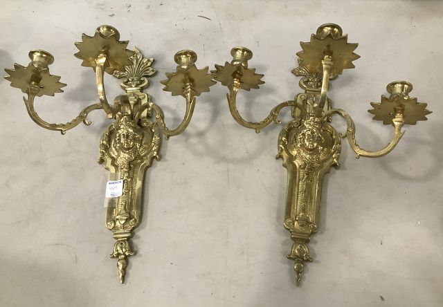 Pair of Vintage Brass Wall Candle Sconces, three arm with portrait faces, 16"h. Pair of Vintage Brass Wall Candle Sconces, three arm with portrait faces, 16"h.