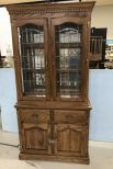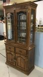 Vintage Oak Double Door China Cabinet, leaded glass doors, two glass shelves, two pieces, lighted, good condition, 79"h., 39"w., 17"d. Vintage Oak Double Door China Cabinet, leaded glass doors, two glass shelves, two pieces, lighted, good condition, 79"h., 39"w., 17"d.