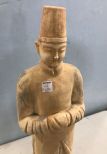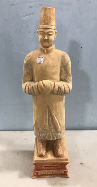 Tomb Mud Pottery Statue, Asian, three pieces, head, body, base, 28"h. Tomb Mud Pottery Statue, Asian, three pieces, head, body, base, 28"h.