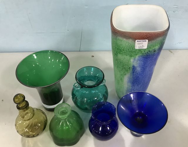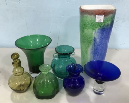 Seven Decorative Art Glass Pieces, vases, compote, decanters, tallest is 12"h. Seven Decorative Art Glass Pieces, vases, compote, decanters, tallest is 12"h.