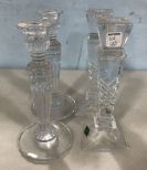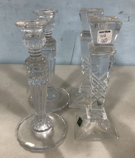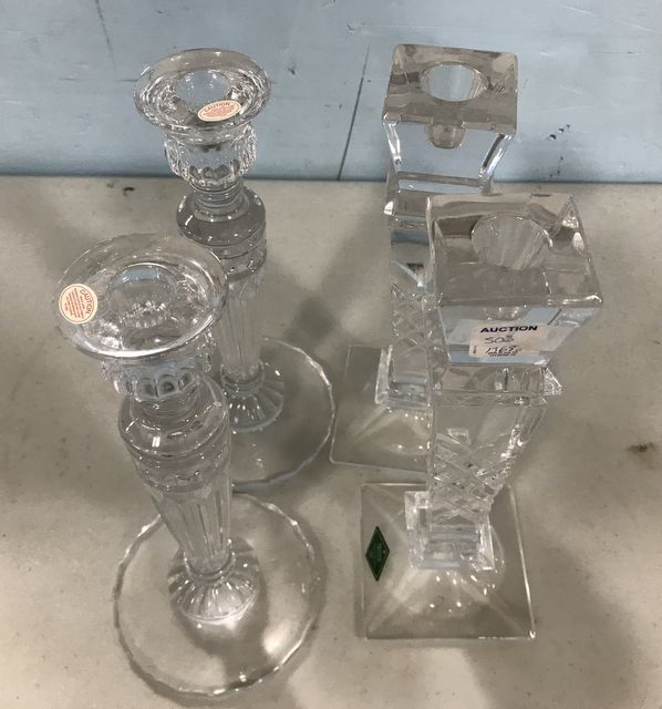 Two Pair of Crystal Candle Sticks, one set is Shannon Crystal company, 10"h. Two Pair of Crystal Candle Sticks, one set is Shannon Crystal company, 10"h.