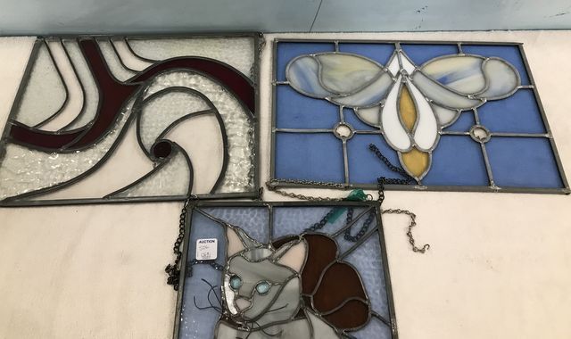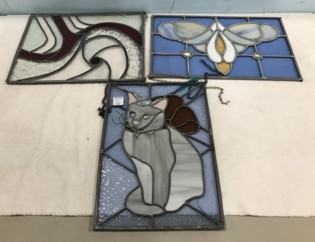 Three Stained Glass Leaded Panels, Assorted styles, one is of Cat, two have small cracks, 14" x 10". Three Stained Glass Leaded Panels, Assorted styles, one is of Cat, two have small cracks, 14" x 10".