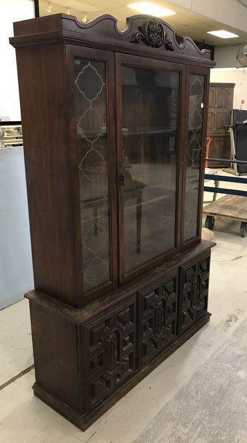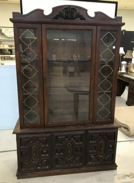 Vintage Mid Century Style China Cabinet, one piece, glass door, two glass shelves, needs cleanings, 77"h., 50"w., 16"d. Vintage Mid Century Style China Cabinet, one piece, glass door, two glass shelves, needs cleanings, 77"h., 50"w., 16"d.