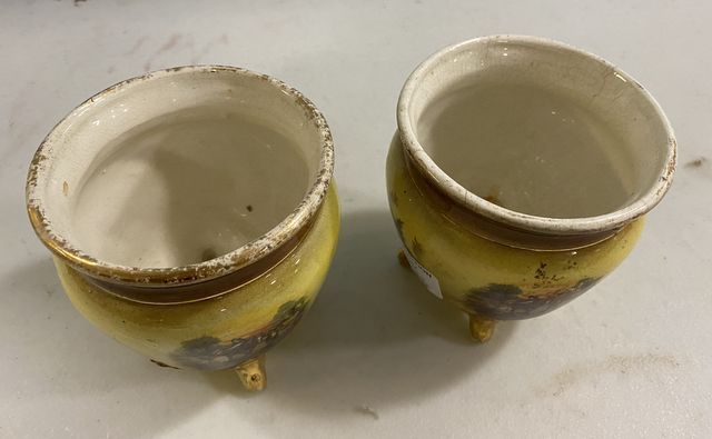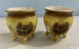 Two English Porcelain Footed Vases, hand painted English scene, has age wear, 4 1/2"h., 4"dia. Two English Porcelain Footed Vases, hand painted English scene, has age wear, 4 1/2"h., 4"dia.