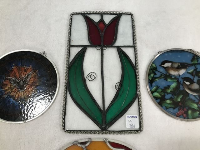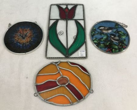 Four Small Stain Glass Hanging Panels, floral rectangle, three round, with two bird designs, 6"dia. Four Small Stain Glass Hanging Panels, floral rectangle, three round, with two bird designs, 6"dia.