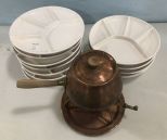 Fondue Brass Pot, with stand and burner, Fondue Serving Plates, total, twelve. Fondue Brass Pot, with stand and burner, Fondue Serving Plates, total, twelve.