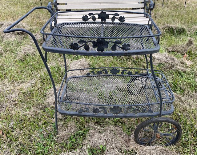 Wrought iron flower push cart, two tier, diamond pattern, handle, on wheels. Wrought iron flower push cart, two tier, diamond pattern, handle, on wheels.