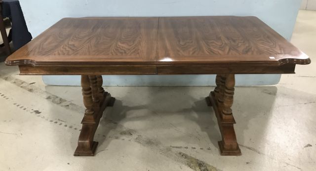 Late 20th Century Oak Finish Dining Table, double pedestal, single leaf, light wear, without leaf table is 29"h., 42"w., 66"long. Late 20th Century Oak Finish Dining Table, double pedestal, single leaf, light wear, without leaf table is 29"h., 42"w., 66"long.