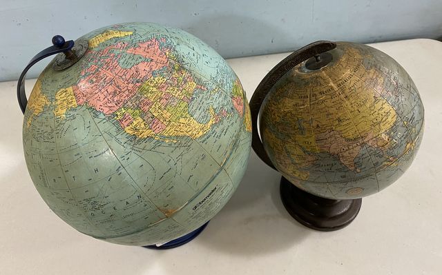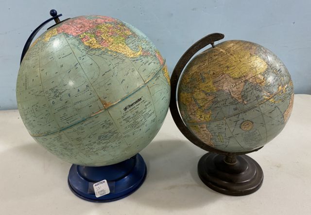Pair of Vintage Globes by Globemaster, with stands, smaller one has dent in top, 13"h. Pair of Vintage Globes by Globemaster, with stands, smaller one has dent in top, 13"h.