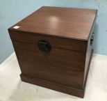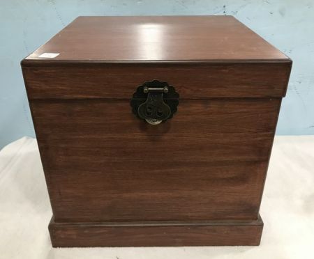 Oriental Lift Top Storage Box, handles, Oriental brass latch, has light scratches, 15"h., 16"w. Oriental Lift Top Storage Box, handles, Oriental brass latch, has light scratches, 15"h., 16"w.