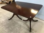 Vintage Duncan Phyfe Mahogany Double Pedestal Dining Table, with single leaf, brass cap, 29"h., 56"long. Vintage Duncan Phyfe Mahogany Double Pedestal Dining Table, with single leaf, brass cap, 29"h., 56"long.