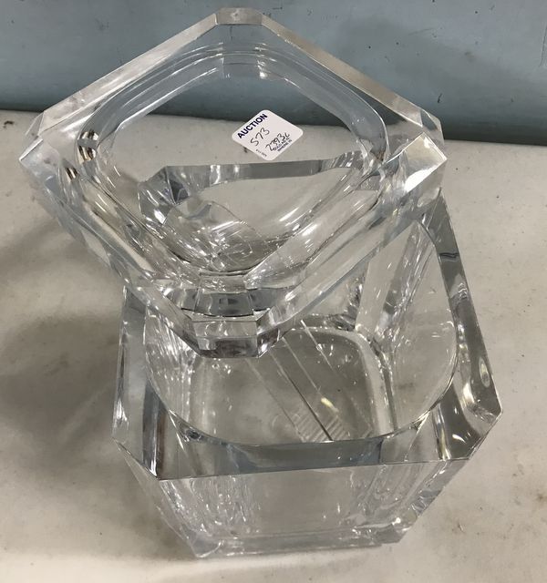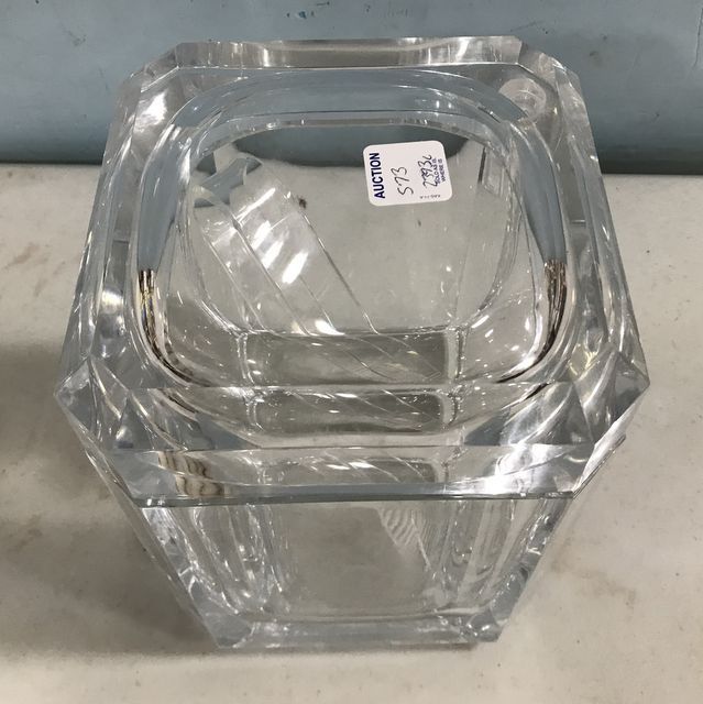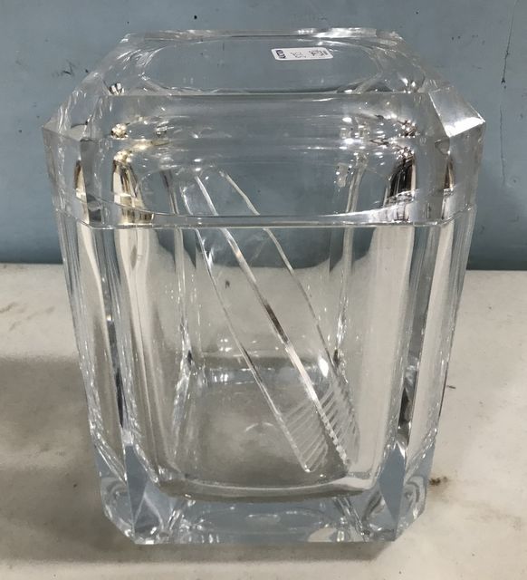 Art Deco Inspired Heavy Acrylic Ice Chest, with hinged swing top and ice tongs, 9"h., 7"w. Art Deco Inspired Heavy Acrylic Ice Chest, with hinged swing top and ice tongs, 9"h., 7"w.