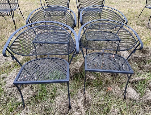 Four Wrought Iron Patio Arm Chairs, diamond pattern, black, good condition. Four Wrought Iron Patio Arm Chairs, diamond pattern, black, good condition.
