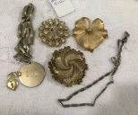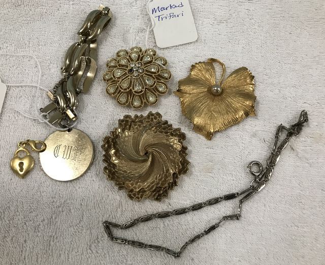 Group of Costume Jewelry Pieces, Monet Bracelet with monogrammed pendant, Trifari pin, Cora pins, heart pendant and chain. Group of Costume Jewelry Pieces, Monet Bracelet with monogrammed pendant, Trifari pin, Cora pins, heart pendant and chain.