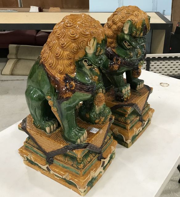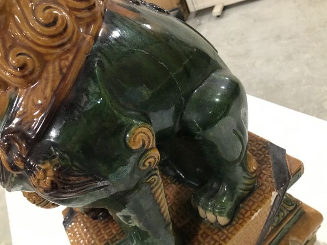 Modern Ceramic Foo Dog Statues, hand painted, one is damaged, has been repair, has chips, 24"h. Modern Ceramic Foo Dog Statues, hand painted, one is damaged, has been repair, has chips, 24"h.