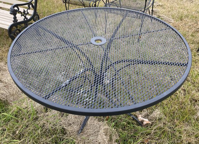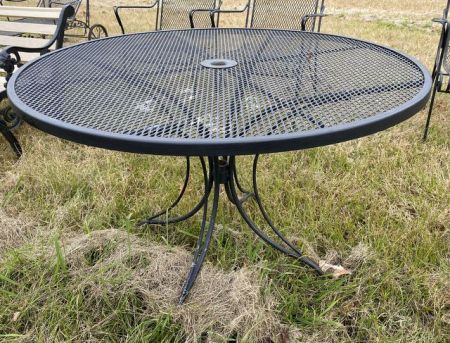 Wrought iron patio table, diamond pattern, pedestal, with umbrella slot, black. Wrought iron patio table, diamond pattern, pedestal, with umbrella slot, black.