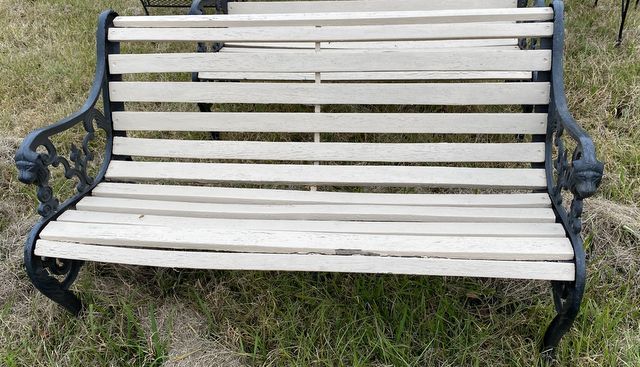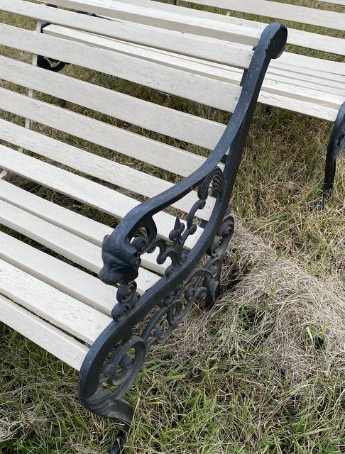 Outdoor Wood and Iron Bench, iron sides with lion heads. Outdoor Wood and Iron Bench, iron sides with lion heads.