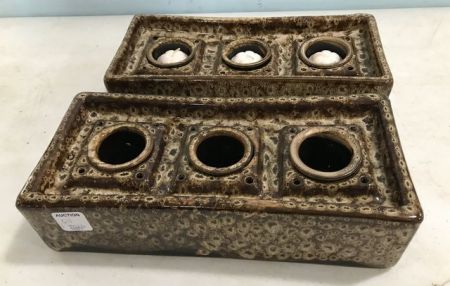 Two Decorative Glazed Ceramic Candle Holders, three section candle slots, 3"h., 11 1/2"w. Two Decorative Glazed Ceramic Candle Holders, three section candle slots, 3"h., 11 1/2"w.