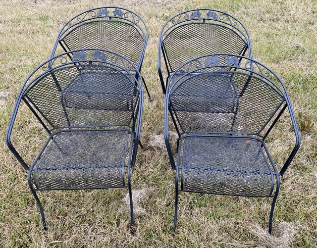 Four Wrought Iron Patio Arm Chairs, diamond pattern, black, good condition. Four Wrought Iron Patio Arm Chairs, diamond pattern, black, good condition.