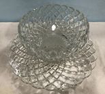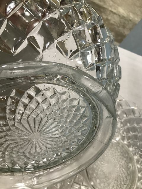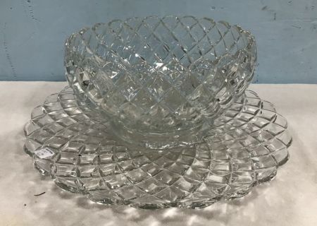 Large Pressed Glass Punch Bowl, has chip on bottom base, missing silver plate base, 7"h., 12"dia and Platform in good condition, 20"dia. Large Pressed Glass Punch Bowl, has chip on bottom base, missing silver plate base, 7"h., 12"dia and Platform in good condition, 20"dia.