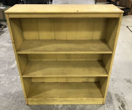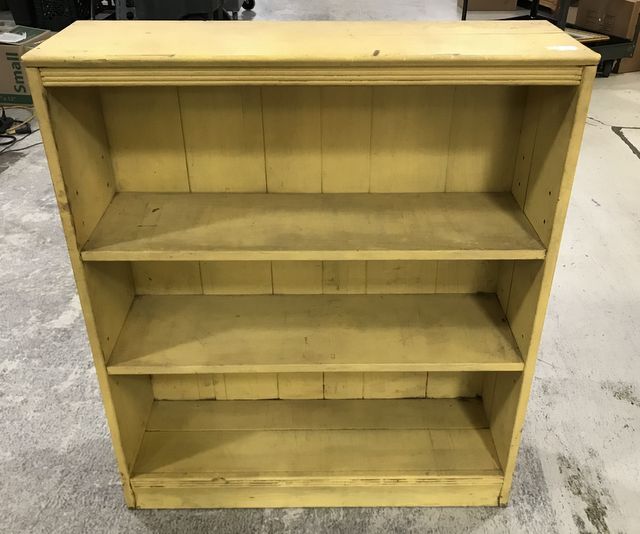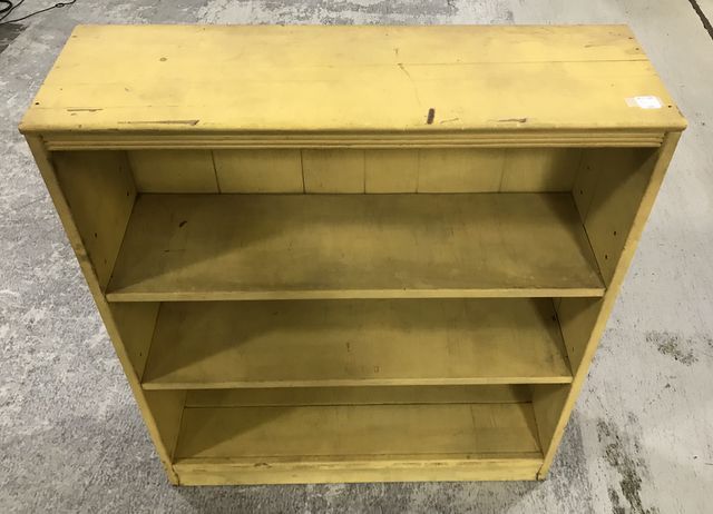 Vintage Yellow Painted Bookshelf , two shelves, has wear but functional, 35"h., 30"w., 9"d. Vintage Yellow Painted Bookshelf , two shelves, has wear but functional, 35"h., 30"w., 9"d.