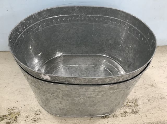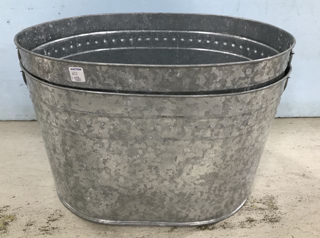 Two Galvanized Buckets, with handles, like new, 13"h., 22"w. Two Galvanized Buckets, with handles, like new, 13"h., 22"w.