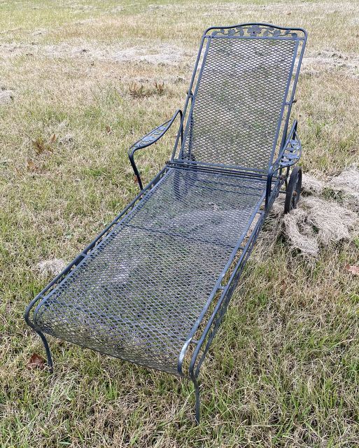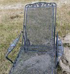 Wrought Iron Patio Lounger, diamond pattern, adjustable back, on wheels, black. Wrought Iron Patio Lounger, diamond pattern, adjustable back, on wheels, black.