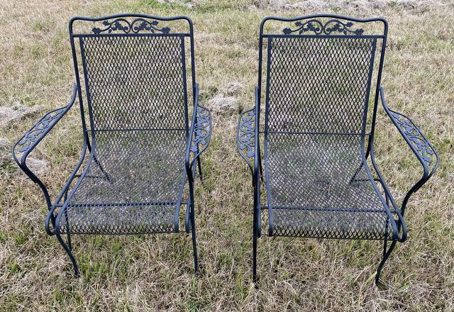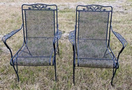 Pair of Wrought Iron Patio Arm Chairs, diamond pattern seat, good condition. Pair of Wrought Iron Patio Arm Chairs, diamond pattern seat, good condition.