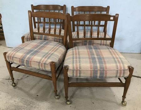 Four Early American Style Dining Chairs, spindle, on casters, striped upholstery, 30"h. Four Early American Style Dining Chairs, spindle, on casters, striped upholstery, 30"h.