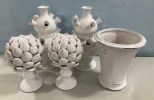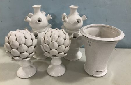 Contemporary white pottery pieces, two planter vases, planter, and plaques. Contemporary white pottery pieces, two planter vases, planter, and plaques.