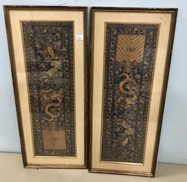 Pair of Oriental Silk Panels framed, matted, 27"h., 12"w. Pair of Oriental Silk Panels framed, matted, 27"h., 12"w.