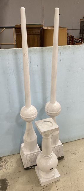 Pair of Wood white painted decor columns, 61"h., and wood white painted candle/plant stand, 25"h. Pair of Wood white painted decor columns, 61"h., and wood white painted candle/plant stand, 25"h.
