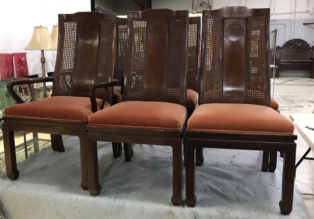 Oriental Mahogany Dining Table, rectangle, light finish wear & 6 Oriental cane back dining chairs, two arms, four sides. Oriental Mahogany Dining Table, rectangle, light finish wear & 6 Oriental cane back dining chairs, two arms, four sides.