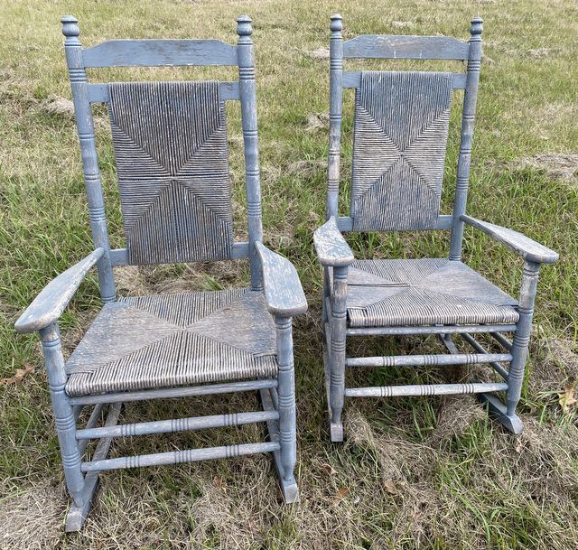 Pair of Wood Patio Rocking Chairs, woven seat and back, weathered condition, sturdy. Pair of Wood Patio Rocking Chairs, woven seat and back, weathered condition, sturdy.