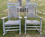 Pair of Wood Patio Rocking Chairs, woven seat and back, weathered condition, sturdy. Pair of Wood Patio Rocking Chairs, woven seat and back, weathered condition, sturdy.