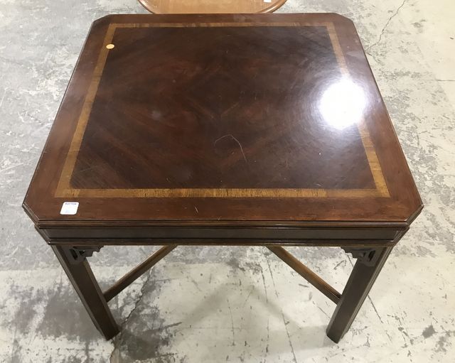 Chinese Chippendale Square Lamp Table, banded style top, modern piece, cherry, has scratches on top finish, 22"h., 27"w. Chinese Chippendale Square Lamp Table, banded style top, modern piece, cherry, has scratches on top finish, 22"h., 27"w.
