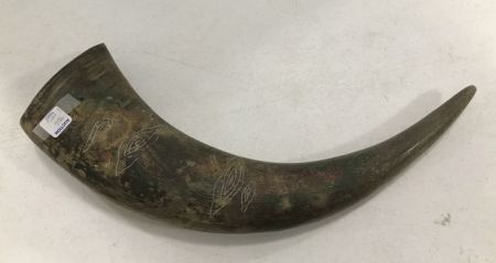 Water Buffalo Horn Decoration, has carved designs, 18". Water Buffalo Horn Decoration, has carved designs, 18".